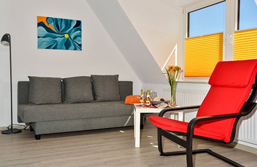 El apartamento está situado en el ático. Pueden ser alcanzado por una escalera y tiene 2 habitaciones, d. H. Una sala de estar con cocina americana, un dormitorio, un cuarto de baño, haciendo un total de unos 35 metros cuadrados. En la sala de estar un LED - pantalla plana disponibles y conexión a internet Wi-Fi disponible. La habitación está amueblada con una cama doble 160 x 200 cm y un armario. La cómoda cocina tiene vitrocerámica, microondas con grill, cafetera, tostadora y máquina de café y un comedor completo y utensilios de cocina conjunto. El baño tiene una ducha, un lavabo y un inodoro spülrandlosen. El apartamento está muy bien amueblada y decorada con temas específicos. Una terraza con muebles de jardín y barbacoa está disponible. Un aparcamiento de bicicletas está en el patio.