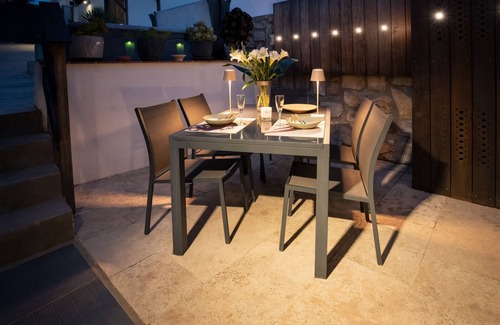Este alquiler vacacional cuenta con una zona exterior privada con bañera de hidromasaje y jardín.