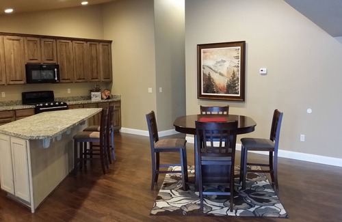 Hermoso apartamento más nuevo (2016) de 2000 pies cuadrados con estacionamiento en garaje adjunto para 2 automóviles con puerta de garaje de 8 ', además de un amplio estacionamiento a un lado para su bote, ATV o remolque. Fended Dog Run convenientemente conectado al garaje, no es necesario poner a los perros con correa para entrar en la carrera de perros. La cama principal incluye una nueva cama King de primera línea, con baño principal y vestidor. El segundo dormitorio incluye una nueva cama queen de primera línea y está al otro lado del pasillo del segundo baño completo, con una combinación de bañera y ducha. La tercera cama es una cama doble extraíble de espuma viscoelástica de primera calidad. Amplia sala de lavandería con lavadora y secadora. Amplia cocina con estufa de gas, hornos dobles, microondas, lavavajillas y otros pequeños electrodomésticos. Isla muy grande con encimera de granito. Asientos de mesa de comedor 6. Enorme salón con capacidad para 7 personas. Gran cubierta cubierta para disfrutar de las vistas a la montaña.
