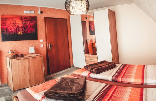 El apartamento de 2 habitaciones (para no fumadores), amueblado con amor y recientemente renovado, con balcón orientado al este, se encuentra en el primer piso de la casa, tiene unos 42 m² y ofrece espacio suficiente para dos personas. Un pequeño pasillo conecta la sala de estar, el baño y el dormitorio. El dormitorio tiene una cama doble (180 x 200 cm) con somier eléctrico, así como un armario con espejo y una cómoda. Nuestros edredones son de gran tamaño (155 x 220 cm). El salón tiene una amplia sala de estar y comedor con una cocina totalmente equipada y un cómodo sofá de esquina. En el apartamento todas las persianas son eléctricas.