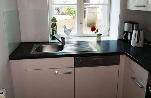 La cocina es espaciosa con lavadora incl. Secadora equipada y lavavajillas. Una moderna cama king size, un gran armario y una cómoda están en el dormitorio.