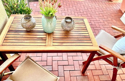 El apartamento de 70 metros cuadrados está en la planta baja y cuenta con una sala de estar con comedor, un dormitorio con una cama con somier (1,80 x 2,00 m), un baño con ducha de piso a techo y una cocina empotrada de última generación (lavavajillas, cafetera Jura, horno, vitrocerámica). Desde la sala de estar y desde la cocina se llega directamente a la terraza y se puede disfrutar de la hermosa vista.