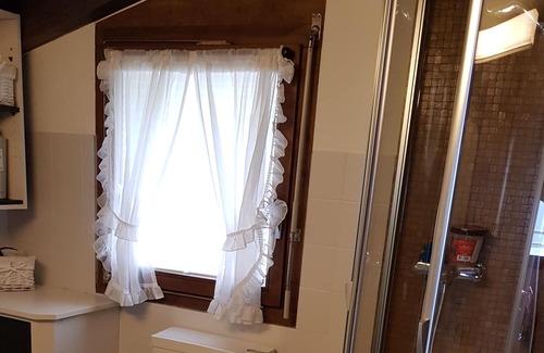 Baño / WC. Balcón 10 m2, orientación sur. muebles de terraza. Vista panorámica al lago, a las montañas y al resort.