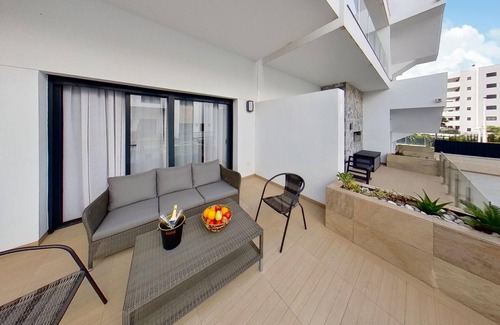 Bonito, moderno y luminoso piso de vacaciones con dos terrazas y piscina comunitaria cerca del mar.