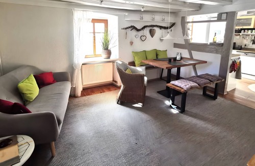 Nuestro apartamento vacacional de unos 150 m² se encuentra en una casa de entramado histórico de 1801, restaurada y decorada con gran atención al detalle. Una amplia cocina-salón con terraza soleada se sitúa en la primera planta. En la segunda planta hay dos dormitorios grandes, cada uno con una cama doble y una individual, un pasillo central con espacio de oficina y un baño luminoso. Otra cama individual se encuentra en la buhardilla.