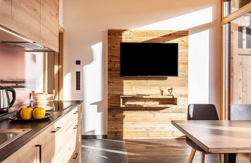 En los apartamentos amueblados con estilo, la atención al detalle se centra en el tratamiento de la madera antigua y garantiza un ambiente acogedor y alpino.