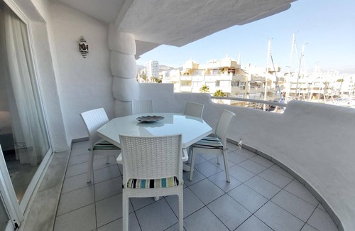 Los apartamentos disfrutan de vistas directas al puerto, justo frente a los barcos y con una piscina abierta todo el año en la terraza del edificio.