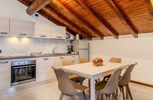 2-room apartment 60 m2, on the top floor. Comfortable furnishings: large living/sleeping room with sloping ceilings with 1 double sofabed and TV. Open kitchen (oven, dishwasher, 4 induction hot plates, toaster, kettle, microwave, electric coffee machine) with dining table. Shower/bidet/WC. Air-conditioning. Small balcony, patio. Balcony furniture. Beautiful view of the countryside. Facilities: washing machine (extra). Children's high chair, baby cot for up to 2 year olds, hair dryer. Internet (WiFi, free). Parking (1 car). Please note: non-smokers only. Maximum 1 small pet/ dog allowed. Private entrance, fire extinguisher. IT013216C2FD4434PS