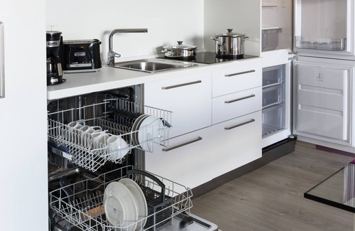 There is a separate utility room with washing machines, dryer and iron + ironing board on the ground floor of the residence for the guests to use.