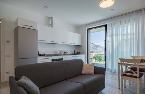 Delightful modern and comfortable two-room apartment, will welcome you in the most famous location of Lake Sebino. Very close to the center (reachable on foot) and to all services, bars, restaurants and main tourist attractions but in a quiet area. The apartment is modern equipped with all comforts including underfloor cooling system that will allow you to enjoy the Isean summer. The spacious balcony furnished with comfortable sofas will amaze you with its lake view. Inside, the living area consists of a kitchenette equipped with oven, dishwasher, coffee pod machine, fridge and freezer and living room with 2 sofas, one of which converts into a double bed, flat screen TV and large table with 6 chairs. The bathroom with shower and washing machine is simple but spacious. Finally, in the bedroom you will also find a cot and changing table for your baby. Possibility to park the car in the parking lot reserved for the condominium. Our facility does not have private compartments/rooms to store bicycles/kayaks/canoes or anything else. No bulky sports equipment of any kind can be brought into the apartment.