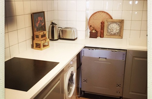 Cocina abierta totalmente equipada: placa eléctrica, fregadero, lavavajillas, lavadora / secadora, nevera, tostadora, hervidor de agua, cafetera, utensilios de cocina, vajilla, etc.