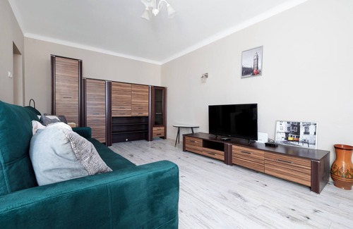 Bałuty Standard Studio is a practically furnished apartment that features a living room with a sofa bed, a kitchen, and a bathroom. Guests have access to a range of practical amenities, including free Wi-Fi, cable TV, a washing machine, an iron, a hairdryer, a fridge with a freezer, an oven, and kitchen accessories.