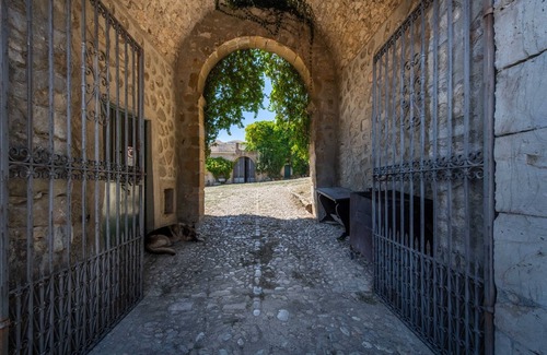 The interiors of the house recall the past of this place, with the placement, the wooden furnishings and original geometric floors. The ground floor houses the rustic-style kitchen, complete with oven, microwave, kettle, coffee machine and toaster and the dining room. The ground floor also features a relaxation and recreation area with some gym equipment and table tennis. Going up through some stairs guests will get to the living area: a first room furnished with a large table leads to two living rooms with sofas, one of which is also a bed. The sleeping area mainly spreads on the first floor with two master bedrooms with a queen-size bed, furnished terrace with panoramic views and ensuite bathroom (one with shower and one with bath), and a bedroom with two single beds and en suite bathroom with bathtub. A second bedroom with two single beds and en suite bathroom with shower is located on the ground floor and overlooks the courtyard. A toilet in the living area completes the layout.