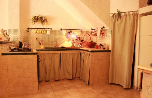 La casa está en dos niveles: en el piso superior hay un hermoso estudio amueblado en un estilo elegante con un sofá cama doble, cocina y baño. Una terraza con jardín y mesa de azulejos. En la planta baja (piso rural) hay un hermoso y fresco patio con mesa, encimera con fregadero y cocina al aire libre, además de un horno de leña y una barbacoa. Dentro de una habitación grande con cocina integrada y sofá cama. Dos habitaciones, una doble y otra con dos literas.