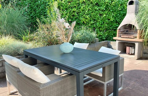 Se pueden estacionar bicicletas y bolardos (por ejemplo, B) en el cobertizo independiente en el jardín. El horno de pizza y los cómodos muebles de jardín se pueden utilizar para las agradables noches de verano.