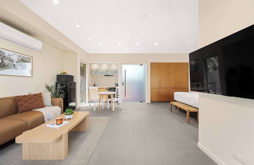 Step into Beachside Bungalow and enjoy the spacious studio layout, complete with high ceilings and stylish finishes. The space features a plush king bed, air conditioning, a porta cot, wardrobe, and a modern ensuite with shower, vanity, and toilet, with bi-fold doors to your own private outdoor area. Unwind on the sofa while watching your favourite shows on the wall-mounted smart TV.