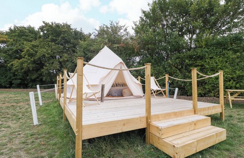 Bell 2, a bell tent, consists of a studio-style living space with a double bed, twin bed (and can accommodate any configuration sleeping up to six on request), fridge, kettle, and living area, along with a communal kitchen and communal shower/toilet block. You'll find a shop in 1.1 miles and a pub in 1.6 miles. WiFi, fuel, power, bed linen, and towels are included in the rent. Outside, there is an open decking with a communal fire pit and off-road parking for three cars. Travel cot, highchair, and stairgate available on request. Two well-behaved pets are welcome. Sorry, no smoking. Whatever the weather, a wonderful stay awaits at Bell 2. Note: Good housekeeping bond of 100 GBP. Note: Disposable barbecues available on request. Note: Please respect the Countryside Code as there are horses on-site and sheep nearby. Note: Please take care with children, as there is a stream nearby. Note: Pod can sleep any configuration up to six people. Note: Property has stables and can offer livery.