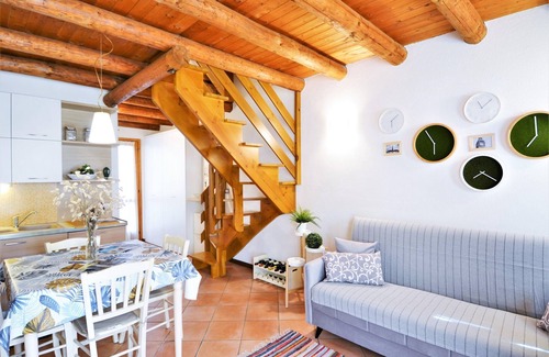 Layout: Ground floor: (Living room(single sofa bed(120 x 190 cm), TV(satellite, smart TV), dining table, decorative fireplace, seating area), open kitchen(hob(5 ring stoves), hood, oven, fridge-freezer), bathroom(shower, washbasin, toilet, bidet, washing machine), balcony or terrace) On the 1st floor: (bedroom(double bed, TV), bedroom(single bed, single bed, single trundle bed), toilet(washbasin, toilet(chemical))) garage(acces via outside stairway), parking