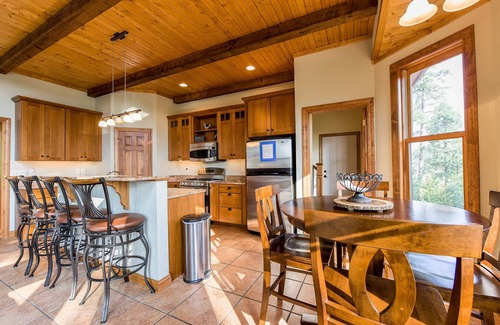 Después de todas sus aventuras diarias, disfrutará de regresar a su hogar de 4,300 pies cuadrados con una chimenea de roca del piso al techo. Suficientemente grande para hasta 17 invitados, pero con mucho espacio para que cada uno de ustedes se extienda mientras disfruta de un futbolín, grandes televisores de pantalla plana con un sistema de entretenimiento Wii y televisión por satélite, así como un área de juegos para niños. ¡La cocina gourmet con isla tiene mucho espacio para todos en su grupo junto con un agradable paseo al área de la terraza donde puede escuchar la brisa y ver la vida silvestre desde su hogar! El dormitorio principal tiene una cama king con bañera de hidromasaje y TV. También encontrará dos camas queen más y dos camas individuales en el nivel principal. Arriba encontrará un dormitorio con una cama king, otro con una cama queen, junto con un altillo abierto con futón.