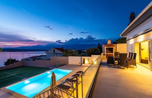 Para la última escapada moderna y vacaciones en el Adriático, Villa Ava en Novigrad cerca de Zadar es sólo el billete. Esta moderna villa en Novigrad ofrece muchas oportunidades para relajarse por completo y olvidarse de la vida cotidiana. El magnífico edificio, protegido para una privacidad absoluta en un total de tres plantas, ofrece placer sin distracciones y las instalaciones interiores y exteriores están equipadas con modernas comodidades para una estancia extremadamente agradable para adultos y niños en un total de 1.000 metros cuadrados. Las zonas interiores y exteriores están cuidadosamente diseñadas con estilo y elegancia atemporal, lo que da como resultado una tranquila sensación de espacio. Una de las características favoritas de esta villa es el hecho de que los espacios interiores y exteriores se comunican idealmente entre sí, creando un conjunto extremadamente agradable con todas sus comodidades modernas y funcionales. En la planta superior hay dos dormitorios amplios, luminosos y modernamente amueblados con cuartos de baño adjuntos de lujoso diseño con bañera y ducha a ras de suelo, uno de los cuales tiene su propia terraza con instalaciones asociadas para relajarse. Junto a las habitaciones, también hay un rincón para relajarse y leer con un sillón de masaje. La planta intermedia consta de un amplio salón amueblado de forma moderna, comedor, cocina, dormitorios, cuartos de baño y, más abajo, un oasis de bienestar con sauna finlandesa y una zona de relajación con acceso a parte de la terraza con bañera de hidromasaje. Desde el salón hay salida a una amplia terraza con vistas al mar y a las montañas Velebit. La terraza está cerrada con una barbacoa de piedra al aire libre. La planta baja es la combinación final de la zona deportiva y recreativa y la zona de hedonismo y entretenimiento en la parte exterior e interior. A saber, la parte interior cuenta con una taberna con cocina y comedor cubiertos al aire libre, luego duchas interiores y exteriores, una zona con mesa de masajes, una sala de juegos con PlayStation, otra sala con futbolín y dardos, y un gimnasio Enfrente hay un proyector para disfrutar del cine de verano. Al lado hay una gran zona de patio con una hermosa piscina de color blanco nacarado, desde la que se puede disfrutar de una vista de todo el campo y el mar de Novigrad, así como la pista de tenis de hierba artificial que la acompaña. En la pista de tenis también hay otras instalaciones deportivas para fútbol y baloncesto. Para una mejor impresión, eche un vistazo a las fotos y experimente visualmente los detalles y decoraciones cuidadosamente seleccionados en el interior y el exterior. Tenga en cuenta que este alojamiento no acepta grupos de jóvenes ni despedidas de soltero. Un grupo juvenil en este alojamiento está formado por personas menores de 30 años. No reserves este alojamiento si eres un grupo de jóvenes o una despedida de soltero, ya que tu reserva será rechazada tras la reserva, lo que también puede ocurrir a la llegada al alojamiento o durante tu estancia, y no recibirás ningún reembolso.