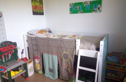 - Dormitorio 3: 1 cama individual de altura media (100 cm) con pequeña escalera.