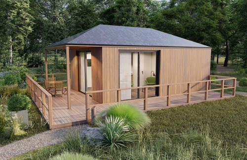 Distribución: Planta baja: (salón(TV), cocina abierta(tetera, microondas, nevera(+ congelador)), dormitorio(cama doble), cuarto de baño(ducha, lavabo, váter)) terraza(cubierta), jardín, muebles de jardín, aparcamiento, piscina(compartido con otros huéspedes, exterior, cubierta)