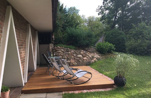 Vacaciones en el bosque en las inmediaciones del lago entre Ratzeburg y Mölln: apartamento en la planta baja completamente renovado / ubicación en la ladera con su propia terraza y acceso directo a la sauna (de pago), mobiliario confortable incl. Cafetera totalmente automática y lavavajillas.