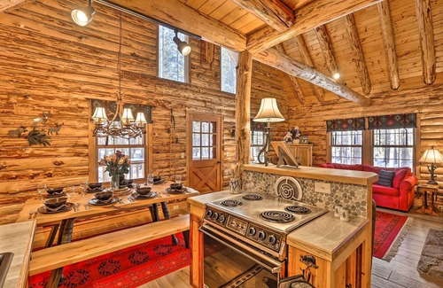 Techos altos, vigas a la vista y un plano de planta abierto hacen que esta espaciosa cabina sea aún más amplia, mientras que cubrecamas y colchas hechas a mano, encantadores coleccionables y cómodos muebles hacen que el espacio se sienta como en casa. Admire el interior de madera auténtica, pelado a mano, mientras tira algunos troncos sobre la estufa de leña y se acurruca en el gran sofá rojo o prepara un juego en la mesa de centro rústica de estilo baúl.