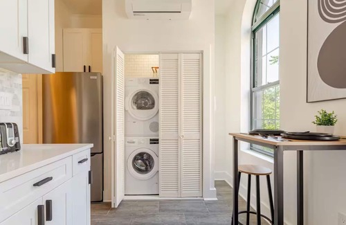 Este alojamiento de 1 dormitorio y 1 baño cuenta con una sala de estar, caja fuerte, aire acondicionado y escritorio. Conéctate al wifi gratis, o relájate frente a un Smart TV. El cuarto de baño incluye un secador de pelo, toallas y papel higiénico. La cocina está equipada con horno, placa de cocina y frigorífico, además de cafetera y tetera, hervidor eléctrico y microondas. Podrás viajar con poco equipaje, porque tendrás una lavadora y una secadora a tu disposición. Otras comodidades incluyen ropa de cama, una tabla de planchar, calefacción y una silla de oficina.