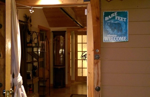 El dormitorio de la reina tiene una puerta corredera de cristal que da a la amplia envoltura de madera alrededor de la cubierta frontal, proporcionando una maravillosa vista del lago y las montañas. El baño completo incluye una bañera con patas encantador del vintage con ducha. Hasta la escalera en el loft es un colchón para dormir de tamaño completo y dos futones individuales. También los huéspedes adicionales pueden dormir las sillas de cuero en la sala de estar convierten al compartimento individual y la otra una cama doble de tamaño.