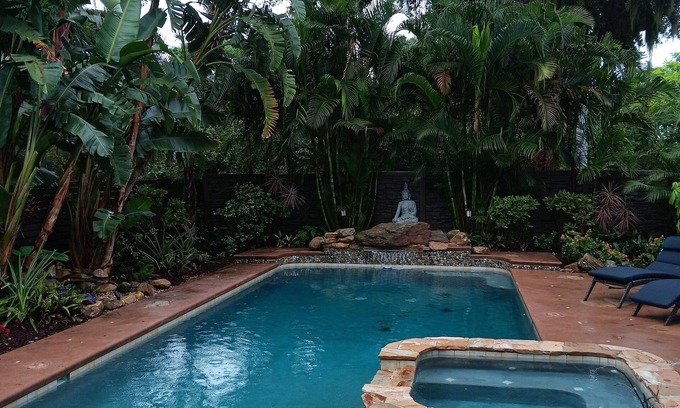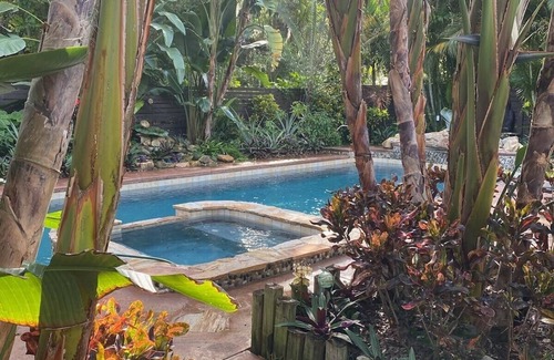 Relájate y disfruta de nuestra laguna tropical en el patio trasero. Incluye una hermosa piscina climatizada de agua salada, cascada, gran bañera de hidromasaje y saltos de roca.