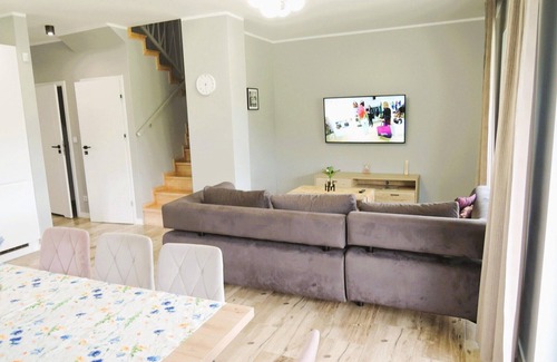 Una casa de vacaciones cómoda, moderna y espaciosa, perfecta para una estancia relajante con una familia numerosa o un grupo de amigos. La propiedad cuenta con un amplio salón, cuatro cómodas habitaciones y dos baños funcionales. La cocina totalmente equipada permite preparar comidas familiares y ofrece todo lo necesario para las aventuras culinarias del día a día. Hemos preparado un parque infantil para nuestros huéspedes más pequeños, y en el exterior, puede disfrutar de la terraza y los muebles de jardín, ideales para relajarse. Una barbacoa le permite preparar deliciosas comidas al aire libre. Para su comodidad, disponemos de acceso a internet, aparcamiento en la casa y un garaje individual para garantizar la comodidad y seguridad de su vehículo. Kołczewo es un encantador pueblo situado en la isla de Wolin, rodeado de lagos y bosques, lo que lo convierte en un lugar de vacaciones ideal para quienes buscan escapar del bullicio de la ciudad. Hay numerosos lagos en la zona, incluyendo el gran lago Kołczewo, situado justo al sur del pueblo, que lleva su nombre. El extenso lago Koprowo se extiende aproximadamente dos kilómetros y medio al noreste. En verano, en el lago Kołczewo hay una estación de agua que ofrece la posibilidad de alquilar bicicletas acuáticas, barcos y kayaks para disfrutar de una recreación activa junto al agua y de los encantos de este pintoresco entorno.