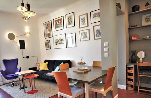 Superb 70m² apartment located in the HYPE district of Nice, 200 meters from a tram station to access the beach and Old Nice. This superb two-bedrooms apartment is located in a building. It's on the top floor (5th /with Lift) and the windows look down on a tranquil street. Very quiet and well-lit, this apartment offers typically Nician charms such as wood mosaic floors, crown mouldings, and a fireplace. The modern decor perfectly compliments the classic interior architecture. The living room is huge. The space is accentuated by the wood beams on the ceiling and walls. This unbelievably comfortable, bright room beckons you to relax in the divan. There is also a television, internet connection and stereo at your disposal. The kitchen open is fully-equipped, permitting you to prepare and serve your meals at home. There are 2 bright and tranquil bedrooms with a double bed and plenty of room for your belongings. The mosaic tiled bathroom is perfectly functional and comfortable. The toilets are separate from the bathroom and you'll also have a washer set in the apartment. The comfort and quality of this apartment make it a rarity, ideally located the perfect place to stay in the heart of Nice!
