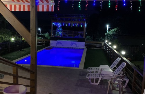 Tiene los siguientes complementos que son compartidos con los demás huéspedes: Piscina Compartida, BBQ (Se reserva el horario que lo quieres usar cuando llegues), Gazebo, Tarima, Área Verde,