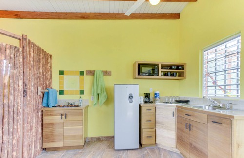 Estarás a solo unos pasos de la playa en esta alegre cabaña de Dangriga, una casa estilo estudio con un porche y una hamaca con hermosas vistas del mar Caribe.