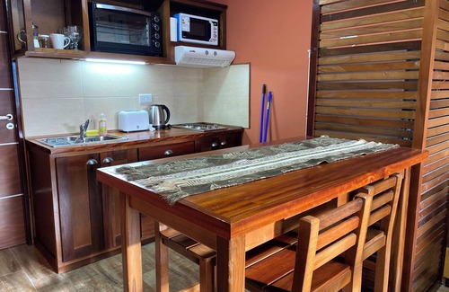 Cocina totalmente equipada con electrodomésticos (cafetera, pava eléctrica, microondas, tostadora, embolo para infusiones), y utensilios para cocinar, con vajilla y cristalería.