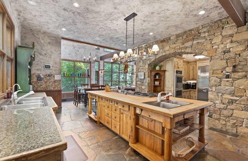 Si finalmente se ha cansado, es hora de acomodarse para pasar la noche. Elija una de las 12 habitaciones distribuidas en todos los niveles de la casa. Pase una noche de lujo mientras se relaja en su bañera privada y se calienta junto a la chimenea de su habitación, antes de apagar las luces. Después de despertarse con el sonido del arroyo cercano, tendrá otro día de aventura y ocio por delante. Disfrute del desayuno en la cocina bañada por el sol o descanse en la terraza al aire libre de su elección. Las mesas del comedor y de la cocina pueden albergar cómodamente hasta 21 personas. Pase la mañana explorando el elaborado sistema de trenes, que está suspendido en lo alto y viaja a través de las paredes del piso principal. Piérdete explorando las infinitas delicias de la casa, que incluyen una escalera de caracol que conduce a dos habitaciones ocultas, un arenero a la sombra y un columpio al aire libre para niños, amplios jardines para cenar y reunirse al aire libre, dos habitaciones con literas, música con bluetooth, Alexa, 3 televisores de pantalla plana, calefacción radiante en toda la casa, un paisajismo exquisito, un generador (que se encenderá automáticamente en caso de que la casa se quede sin energía) y un sinfín de aventuras al aire libre. Si viajas por negocios o organizas un retiro de la empresa, hay un minicentro de negocios ubicado convenientemente en el piso principal y está equipado con una impresora, una pizarra y una selección de suministros básicos de oficina en caso de necesidad.