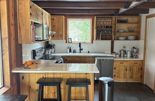 La cabaña fue construida por los padres de Ben a principios de los años 80 y fue renovada una vez que la asumimos como hogar familiar. Se actualizaron los electrodomésticos, se reemplazaron todas las ventanas y se compraron los muebles recientemente. Toallas, sábanas, colchones, alfombras y pisos de baño nuevos le dan a la cabina una sensación fresca. La chimenea de leña crea un ambiente acogedor y calienta la cabina bien en invierno. También hay un calentador de monitor, si es necesario. El plano de planta está abierto con una sensación de loft.