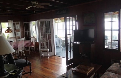 Perfecto para el tiempo en familia o entretenido. Camelot tiene una cocina completa, área de parrilla al aire libre, amplio espacio para comer, sala de estar con chimenea y una gran terraza que se extiende desde la cabaña hasta el acantilado. Dos dormitorios con camas de tamaño completo se complementan con un loft, que incluye un conjunto de literas que es ideal para niños. Duerme hasta ocho personas. Un baño completo está en el piso principal.