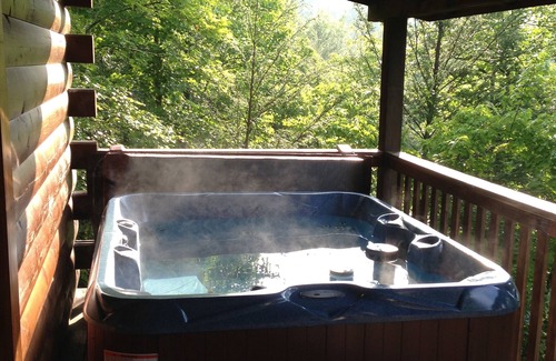 Cabin Fever tiene dos porches cubiertos. El porche trasero completamente cubierto le permite privacidad, ya sea que se balancee en las mecedoras o disfrute de un chapuzón en el jacuzzi al aire libre mientras contempla los hermosos bosques y una vista clara del monte Leconte. Te encantará el columpio en el porche.