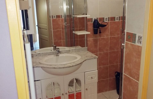 Un baño con ducha y mueble con lavabo con secador de pelo y toallas calefactoras adicionales disponibles en los muebles.