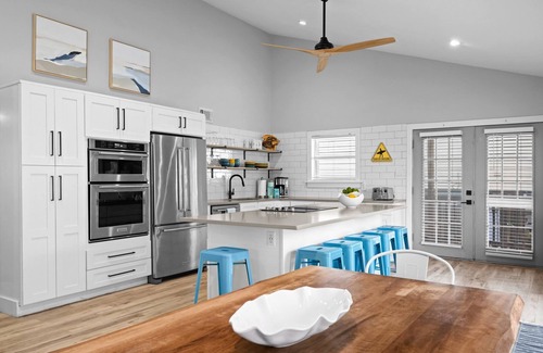 Esta casa de playa tiene una gran cocina totalmente equipada que contiene todo lo que necesita para alimentar a sus amigos y familiares. La hermosa isla grande en la cocina es el corazón de la casa. La isla tiene capacidad para 6 personas y la hermosa mesa de comedor con capacidad para hasta 10 personas. Para tomar un café por la mañana o comer al aire libre, justo afuera de la cocina, la sala de estar cubierta es perfecta para 5 personas con sillas adirondack alrededor de la terraza lateral para 4 personas más.