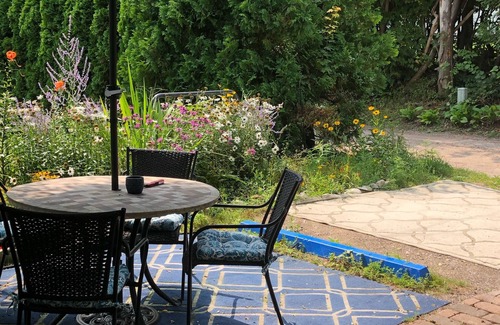 Estudio privado - ¡Adorable! Perfecto para una o dos personas. Las puertas francesas dobles se abren a una pequeña calle privada sin pavimentar que cuenta con su propia sala de estar al aire libre para relajarse con un buen libro y su bebida favorita o cenar al aire libre. Nuestros vecinos en ambos lados ofrecen hermosos jardines de flores, ¡tan buenos de ellos! Esta unidad tiene una pequeña cocina, el baño cuenta con una ducha con azulejos, un sofá cama configurado como un acogedor sofá que se convierte en dos camas individuales (alias una cama king), así como un sofá cama plegable.