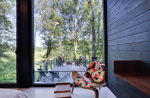 Inspired by the Farnsworth House, this ebony-toned, rectilinear retreat features seamless glass walls, full-height doors, and finishes of walnut wood, porcelain tile, and natural stone. Enjoy the unique touch of pebbled walk-in rain showers, a Japanese soaking tub, and an ultra-contemporary, periscope-style wood-burning fireplace. The décor includes early modernist and mid-century pieces reminiscent of Mies van der Rohe and Richard Neutra.