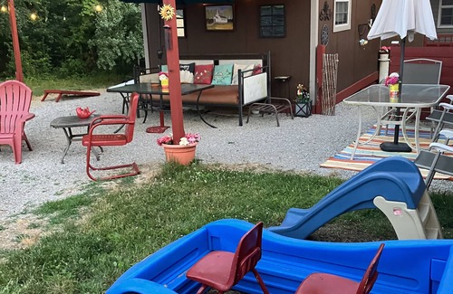 Nuestra tierra es tu patio de recreo ... Hoyo de fuego, bote de remos, futbolín y hoyo de maíz en el lugar, así como muchos espacios verdes y mini bosques para una mini caminata. Espacio al aire libre para descansar y mesa de picnic para cenar.
