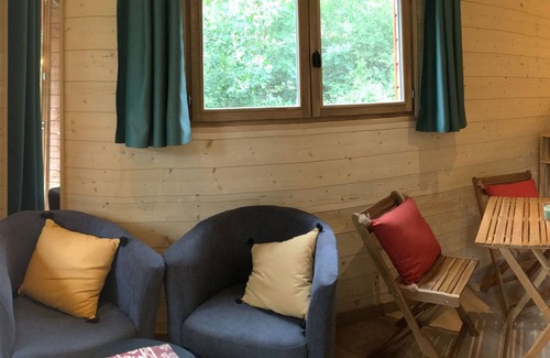 Después de un día de aventura, regresa a la tranquilidad de tu trailer, donde podrás disfrutar de comodidad y amenidades mientras estás rodeado de naturaleza. Una experiencia que combina la autenticidad del pasado con el lujo del presente. En el interior, un cálido salón de 12 m² te recibe con dos sillones y sus pufs, una mesa de centro y una mesa de comedor multiusos, perfecta para relajarte después de un día de aventuras. En la terraza hay una mesa exterior que le permitirá disfrutar de sus comidas al aire libre. También tienes a tu disposición una mesa de jardín, sillas, tumbonas y barbacoa, al pie de la caravana, rodeada de vegetación.