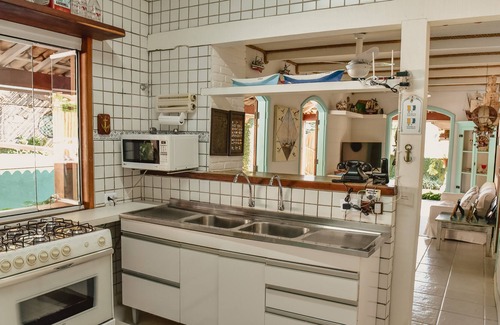 Cocina - integrada el área social - con todos los utensilios incluyendo microondas, sándwich, exprimidor de frutas, licuadora, refractarios y ollas de barro para moqueca de pescado.