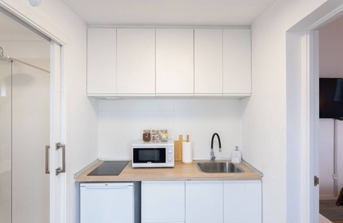 Cocina americana totalmente equipada (nevera, microondas, cafetera, hervidor, exprimidor, vajilla y utensilios)