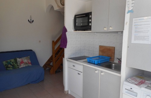 Compuesto en la planta baja: sala de estar con sofá cama; comedor con mesa + sillas y TV; Cocina amueblada (nevera + congelador, placa de inducción, cafetera, tostadora, microondas, horno eléctrico y lavadora).