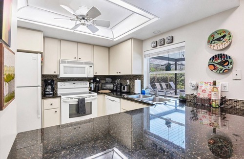 Lo mejor para el final del área exterior de la piscina de lanai está completamente protegida. El exuberante paisaje brinda privacidad y una sensación de resort. Hay una sala de estar al aire libre con 4 sillas y love seat. Para esas noches al aire libre hay una mesa de comedor para 6. Parrilla de gas. 4 sillones para tomar el sol. Fideos de piscina y flotadores están en la casa. Toallas de piscina también se proporcionan. ¡Hay una ducha al aire libre para enjuagar la arena o simplemente para ducharse al aire libre!